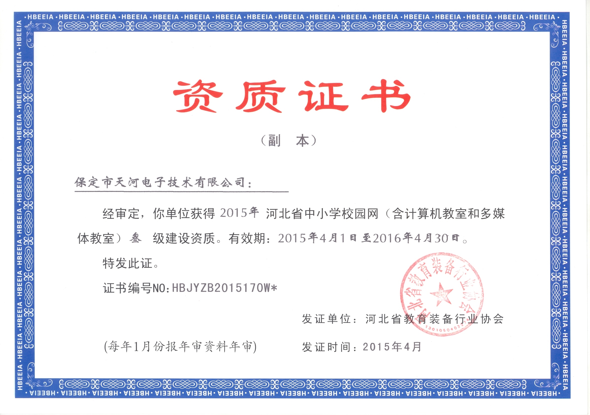 2015年4月我公司獲批河北省中小學校園網(含計算機教室和多媒體教室)叁級建設資質